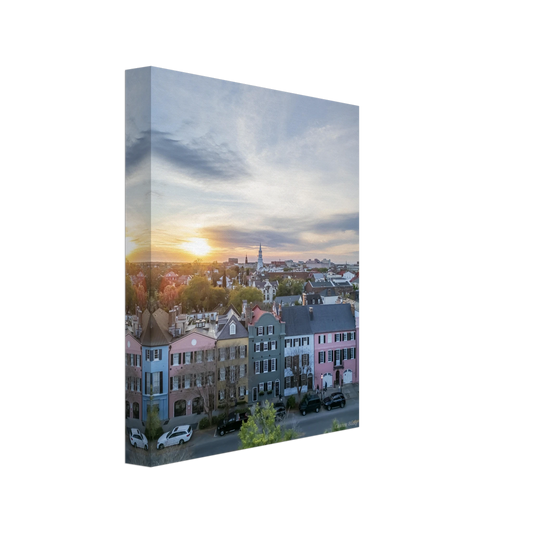Drone View of Rainbow Row Canvas Print - Charleston Wall Art - Colorful Charleston Sunset