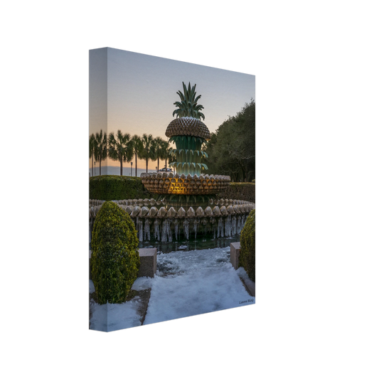 Snowy Pineapple Fountain Canvas Print - Charleston Wall Art - Rare Winter Scene
